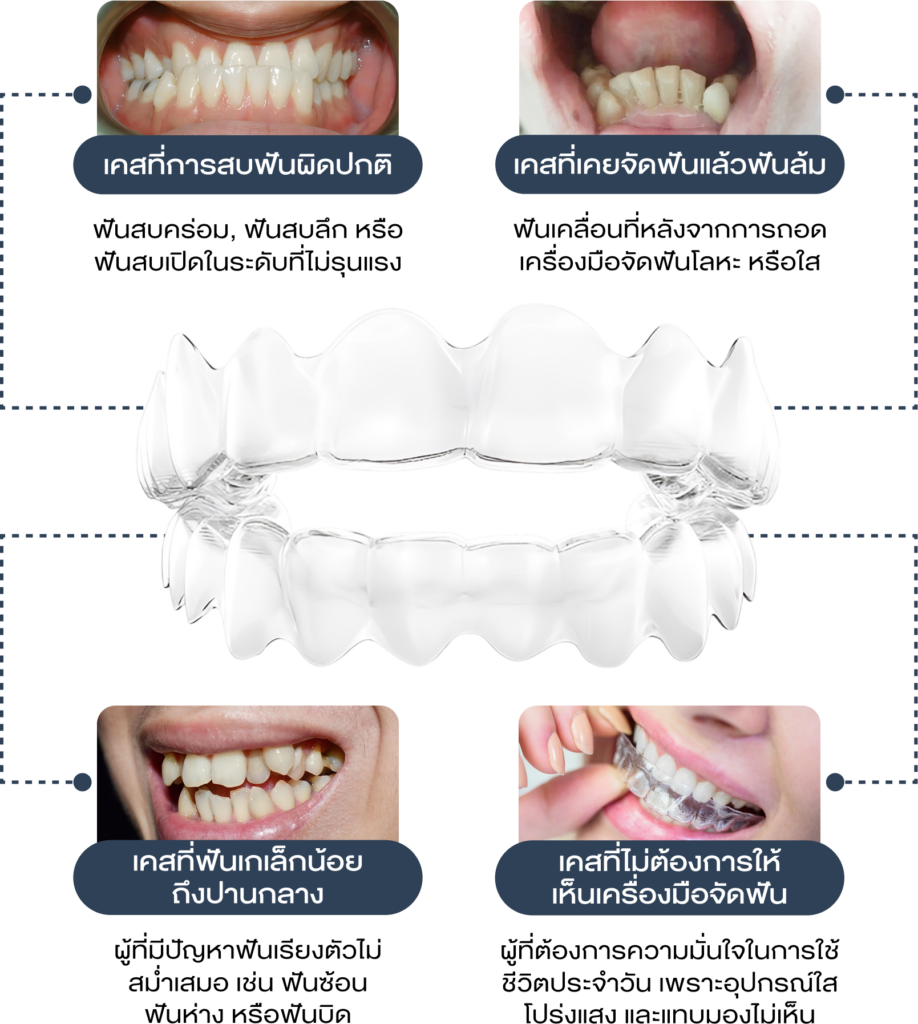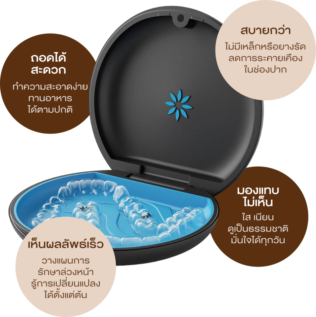 จัดฟันใสช่วยปรับฟันให้เรียงสวยอย่างเป็นธรรมชาติ โปร่งใสไร้เหล็กกวนใจ ถอดทำความสะอาดง่าย สะดวกสบาย
